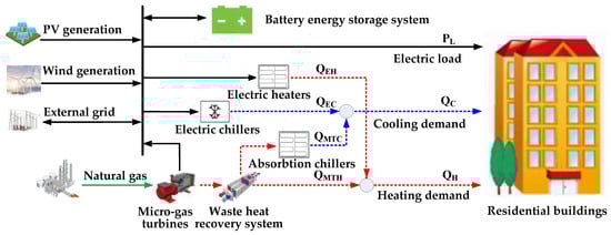 The structure of the RR-microgrid studied in this paper is shown in Figure 1, and it is known that the RR-microgrid consists of renewable DGs, such as photovoltaic generation (PV) and wind generation (WT), a battery energy storage system (BESS), a CCHP unit which is composed of micro-gas turbines (MTs), a waste heat recovery system (WHRS), absorption chillers (ACs), and other devices, like electric heaters (EHs) as well as electric chillers (ECs). In addition, the RR-microgrid is connected to an external grid so that the exchange of electric power is allowed. “Redundant” means that the heating/cooling demand of residential buildings could be satisfied by the CCHP unit as well as EHs/ECs, while the electric load of the residential buildings could be satisfied by clean energy generation, the external grid, and the CCHP unit.