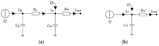 In Figure 2, Q and Qs represent the heating/cooling demand (W) and solar radiation load (W), respectively; Tg, Tz, and Tout represent the radiant floor surface temperature (°C), the operative temperature (°C), and the outdoor temperature (°C), respectively, Cg, Cw, and CA represent the equivalent heat capacities (J/°C) of the radiant floor, the envelope structure, and the indoor air, respectively; RW represents the equivalent heat resistance (°C/W) for the envelope structure, while RZ represents the equivalent heat resistance (°C/W) of convection and radiation from the radiant floor surface to the indoor air and envelope structure.