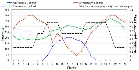 where and are, respectively, the output power of WT and PV at scheduling period t, , , , , and are, respectively, the unit maintenance cost for WT, PV, MTs, EHs, ECs, and ACs.