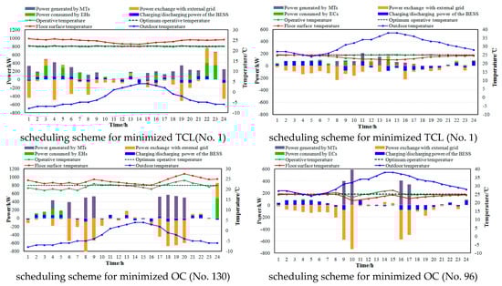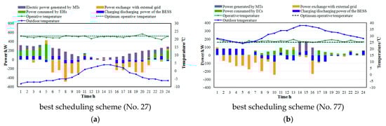 - Due to the VESS capacity of the CHCS being obviously smaller than that of the RFHCS, as for the corresponding best scheduling scheme, the electric power consumed by EHs/ECs and generated by MTs in the RR-microgrid with CHCS are more balanced than that in the R-microgrid with RFHCS. Meanwhile, compared with the condition without VESS, the OC of the RR-microgrid with RFHCS has a greater decline than that of the RR-microgrid with CHCS.