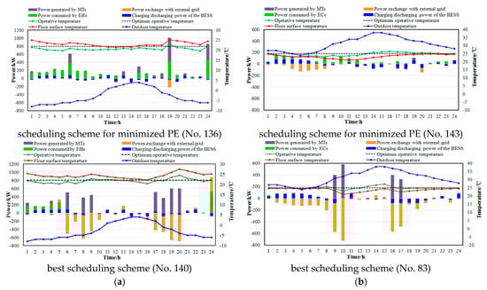 The charge/discharge power characteristics of the two kinds of VESS in the minimized OC scheduling scheme and in the best scheduling scheme are calculated, as shown in Table 15, Table 16, and Figure 16. It can be known that, compared with the VESS of CHCS, the charge/discharge power characteristics of the VESS of the RFHCS in the minimized OC scheduling scheme are more similar with that in the best scheduling scheme. In addition, the mean charging/discharging power and the total charging/discharging amount are obviously greater, indicating that the heat capacity of the heavy radiant floor is much higher than that of the indoor air.