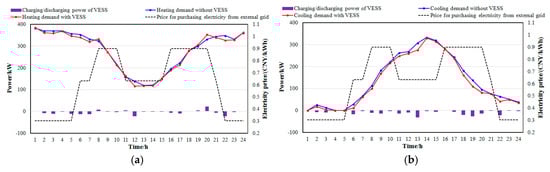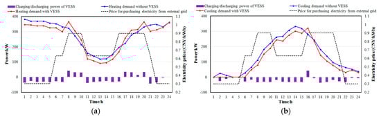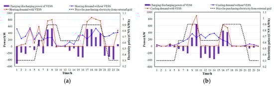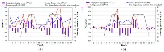 VESS charging/discharging power in best scheduling scheme for RR-microgrid with CHCS. (a) A typical day in winter; and (b) a typical day in summer.