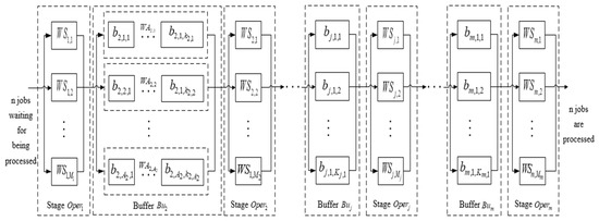 Figure 1 illustrates the scheduling problem in which n jobs are required to be processed in stages [15]. At least one stage in the stages includes multiple parallel machines. Each job is needed to be assigned one machine at each stage. Also, buffers with given capacity exist between stages. The completed job enters the buffer and waits for the availability of the next stage. If the buffer is full, the completed job of the previous stage will stay on its current machine. In this situation, the machine is unavailable and cannot process other jobs until the buffer has available spaces. The buffers contains multiple lanes, and each lane has a limited number of spaces. The job enters the lane from one side and exits the lane from the other side. The jobs that wait for processing form a waiting queue in each lane. When the job enters this buffer, it needs to select one of the lanes and enter its waiting queue. When there is an idle machine in the next stage, it is necessary to select one bus in multiple waiting queues to move out of the buffer for processing. When all the lanes of this buffer reach the upper limit of the capacity, there will also be cases where the job is blocked at the machine of the previous stage. When the job is assigned to the machine, the setup time should also be added besides the standard processing time if the property of the job did not match that of the previous job. The standard processing time of the job at each stage, the online sequence of the job in the production process and the job’s setup times, start time, and completion time at each stage can be obtained through the scheduling, so as to achieve better scheduling results.