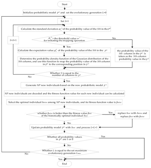 The probability value distribution in was judged by calculating each column of standard deviation in the original probability model . Meanwhile, the standard deviation-based threshold value which started the mapping operation was set to judge whether the probability density function of the Gaussian distribution can be started to map to the new probability model . When , mapping the to the using the probability density function of the Gaussian distribution shown in Equation (23). Then, a new feasible solution (new individual) of the problem was generated in accordance with the . The original probability model was updated through this new feasible solution. After that, this new feasible solution was applied to update the . The scope of searching a feasible solution was magnified through expanding the ability of the to select new feasible solutions.