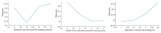 The parameter values of the algorithm had a significant effect on the algorithm’s optimization performance. The ICGA has three key parameters: threshold value that started the mapping operation, adjustment override of the learning rate , and thr number of new individuals generated in each generation . The FFSP standard examples of a d-class problem with five stages and 15 jobs in the 98 standard examples proposed by Carlier and Neron were applied to test each parameter. The example j15c5d3 was used to illustrate the orthogonal experiment. Three parameters, each with four levels (see Table 1), were taken for orthogonal experiments with the scale of L16 (43) [19]. The algorithm ran 20 times in each group of experiments. The average time of makespan () was used as an evaluation index.