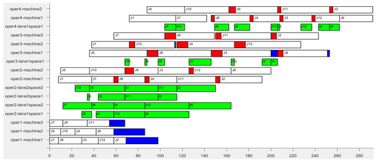 Figure 4 is the Gantt chart of the scheduling result of scheme 8, with time axis as the abscissa and machine of each stage as the ordinate. The green part indicates the residence time of the bus in the buffer. The red part indicates the setup times when the successively-processed buses are with different properties. The blue part denotes the blocking time of the bus on the machine after the completion of the process. The processing route of was . In Figure 4, we can see that at time = 44, completed the processing on machine of stage (the competition time of was 44, namely = 44). At this time, the first lane of buffer had two jobs waiting to be processed ( and ), that is to say, , = 2. The second lane of buffer had one job waiting to be processed (), that is to say, , = 1. The capacity of lane was 2 ( = 2), . And the capacity of lane was 2 ( = 2), . Both of them satisfy the constraint of Equation (10) of the limited buffers. At this time, based on the RCMQB rule which regulates the job’s access to the buffer, we can obtain from Equation (26). The was assigned to space in lane of stage , waiting to be processed at stage . The entry time of the bus into the buffer () was equal to , which satisfied the constraint of Equation (8) of limited buffers.