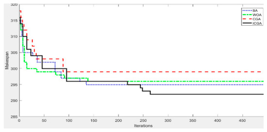 In the table, LB represents the lower bound of makespan for the examples, whose optimal value was given by Santos and Neron [25,26]. It can be seen from Table 2 that even if the data size was small, the average running time of the CGA and ICGA under each group of data was significantly shorter than that of the BA and WOA. This indicates that CGA and ICGA have the advantages of the convergence speed of optimization. In terms of the optimization performance of small-scale data, the four algorithms did not have significant differences. But overall, the optimization effect of the ICGA on small-scale data was still the best among the four algorithms. The ICGA has achieved better solutions than the other three algorithms when solving all four groups of difficult examples (the four algorithms all reached the lower bound of makespan when solving the easy examples). Especially, compared with the CGA, when solving two groups of examples of the j15c5d class, the average relative error obtained by the ICGA was reduced by 5.64% and 4.37%, respectively. This shows that the optimization effect of the ICGA is greatly improved from the CGA when solving small-scale data.