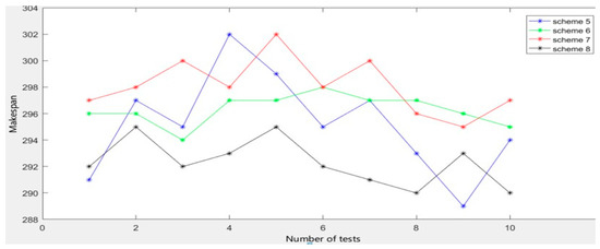 Figure 7 shows the makespan of schemes 5–8 running 10 times separately. For scheme 7, the average value of makespan in 10 tests was 298.1, which was the worst among the four schemes. Although scheme 5 could sometimes obtain better results, the results obtained in 10 tests were not stable enough and were with large fluctuations, easily falling into the local extremum sometimes. Its average value of 10 tests was 295.2. Compared with the other three schemes, the results obtained by the scheme 6 were relatively stable. However, its average result was poor, at 296.3. The average value of the test results of scheme 8 was 292.3, which was the best of all the schemes. The fluctuations of the curve indicate that the magnitude of the change in the results of scheme 8 in 10 tests is small. This shows that when solving multi-queue limited buffers scheduling problems in a flexible flow shop with setup times, compared with the CGA, the ICGA has not only greatly improved the optimization performance, but also improved the stability of the optimization results.