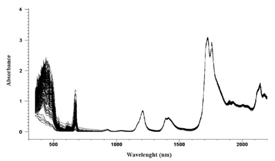 Samples were introduced in a 10-mm quartz cuvette, which was placed in a cuvette accessory joined by fibre optic connectors to the spectrophotometer light source on one side, and to the spectrophotometer detector on the opposite side. This optical path length was selected because it showed higher absorption intensity than 1 mm, 2 mm, and 5 mm path-length quartz cuvettes when acquiring olive oil NIR spectra [7]. NIR spectra from 800 to 2200 nm were then acquired in transmittance mode and recorded using the Indico Pro software (Analytical Spectral Devices Inc. Boulder, CO, USA), each spectral variable matching to a 1-nm interval. The spectrum of each sample was acquired in duplicate.