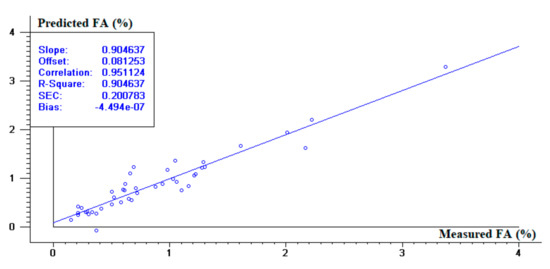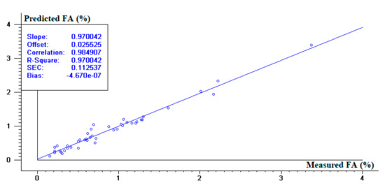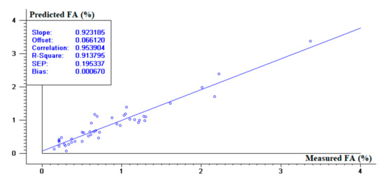 Once it was proved the NIRS was suitable to determine FA in WCO, the second objective of this work was to try to quantify FA in WCO using a narrower NIR range, similar to the typical range provided by portable NIR spectrometers. In this case, the selected range was 950–1650 nm. The PLS model was built using nine principal components, which explained 90.5% of the variation in the FA data. According to the criteria established [12,13,14], this PSL model can be regarded as a good precision model. As shown in Figure 5, the statistics of the calibration model were satisfactory, achieving an acceptable r2c (0.90). However, SEP increased to 0.30% (Figure 6), thus decreasing the RPD value to 2.66. Compared to the model obtained for the 800–2200 nm NIR range, the precision of the model obtained for 950–1650 nm is markedly lower (Table 1).