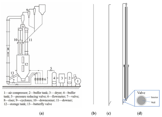 Figure 2a was simulated by different methods. The CFB mainly consists of a riser, a downcomer, a storage tank, cyclones, and a feed pipe with a butterfly valve. The riser is at a height of 18 m and an inner diameter of 80 mm. The downcomer is at a height of 8 m and a diameter of 450 mm. The storage tank is at a height of 6 m and is 660 mm in diameter. The pressure transducer (Skysen, Beijing, China) and optical fiber densimeter (Institute of process engineering, Chinese Academy of Sciences, Beijing, China) were used to measure the hydrodynamics. The particles stored in the storage tank flowed into the inclined feed pipe. Because of the obstacle of the butterfly in the feed pipe, solids circulating rates were controlled by adjusting the opening degree of the valve. In the downstream of the valve, particles flowed into the bottom of the riser and were carried upward by the air from a compressor (Hitachi, Ltd., Tokyo, Japan). The gas–solids mixture in the top of the riser flowed into the cyclone, and particles were separated from the mixture back to the storage tank. To measure the solids circulation rate, the top of the downcomer was divided vertically into two parts with the same volume. Two flap valves were used in the top and bottom of the measuring part. At first, the top valve was opened and the bottom valve was closed. Particles flowed into the measuring part and accumulated. The solids circulating rate was calculated as
