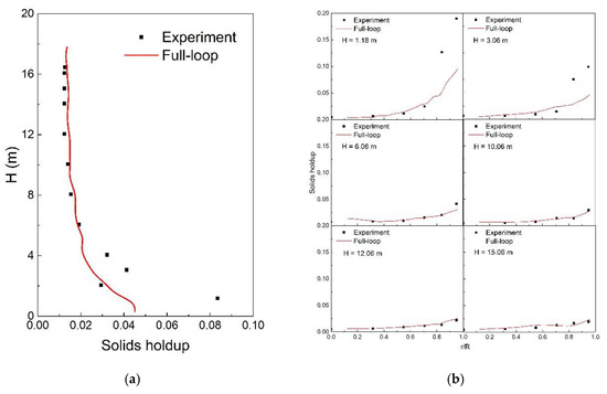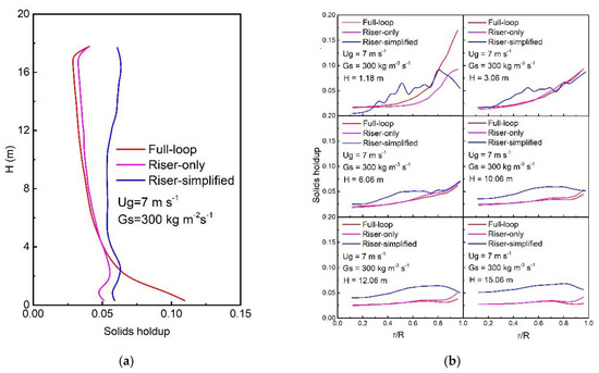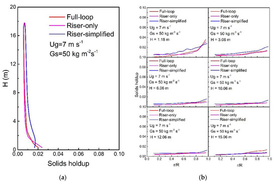 −1. Solids holdup in the axial direction of the riser in the riser-simplified simulation is higher than that in the other two cases, while there is little difference between riser-only simulation and full-loop simulation. As for solids holdup in the radial direction, the solids holdup in riser-simplified simulation is also different from that of the other two methods. According to