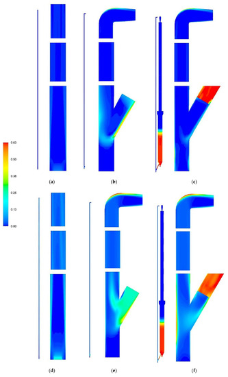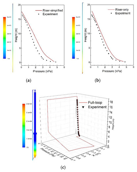 Figure 2b–d. In the riser simulation, the return system is not included in the simulation object. To obtain a more reasonable result, the boundary condition of the solid inlet of the riser should be set up considering the effects of the return system. However, in the current riser simulation, the boundary condition of the solid inlet is usually set up as velocity–inlet with a certain volume fraction. There is little discussion about how to determine the value of the volume fraction, which is usually determined based on experience nowadays. In this work, the solid volume fraction is 0.25, which will be validated in
