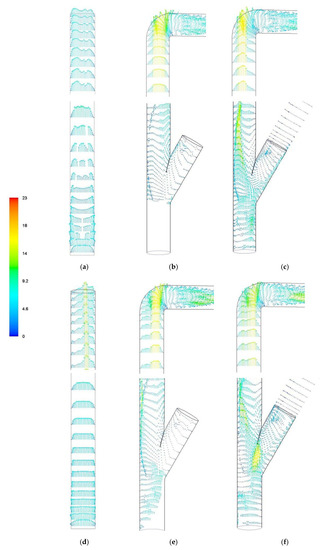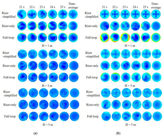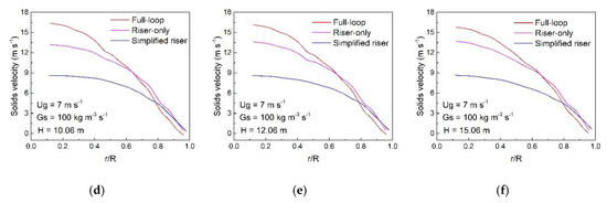 Figure 12 presents the vector of solid velocity in the Y direction among different simulations. In the riser-simplified simulation, though the solid velocity presents parabolic distribution at the bottom of the riser, the solids distribute along the riser, leading to the decrease of the velocity at the center. With the development, the velocity distribution becomes nearly parabolic again. In the riser-only simulation, because of the effects of the inclined feed pipe, particles flow from the inclined pipe to the riser. As a result, many particles collide and reflect with the opposite wall. The velocity at the feed pipe side is larger than at the opposite side. However, in the full-loop simulation, there is a valve in the feed pipe, leading to a non-uniform distribution of the solids. The solids velocity at the opposite side is larger than at the feed pipe side.