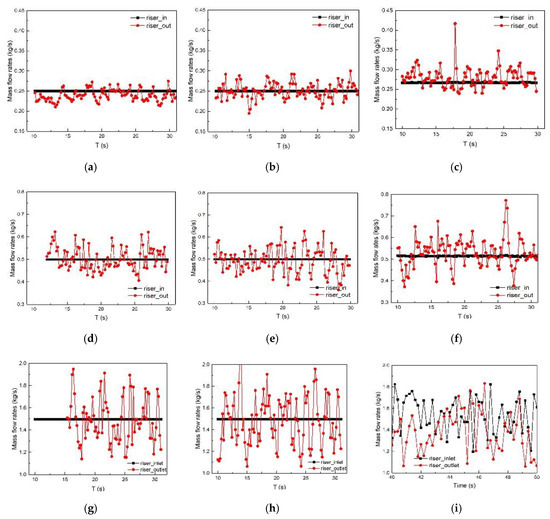 Figure 13 shows the transient mass flow rates in both the inlet and outlet of the riser. In the riser-simplified and riser-only simulation, the Gs in inlet is a constant with no fluctuation, while in the full-loop simulation, the Gs is obtained by calculation. With the increase of Gs, the fluctuation in both the inlet and outlet of the riser increases in full-loop simulation; while only fluctuation in outlet of the riser increases in the riser-only simulation. Higher Gs means more particles move from the storage tank into the riser, leading to more variation of the storage height, which is related to the driving force of the system. Therefore, there is more fluctuation of the solids mass flow rates in higher Gs. However, in the other two simulations, the Gs in the riser inlet is always a constant, which could not reflect the effects of the return system.