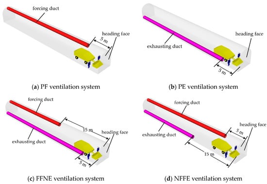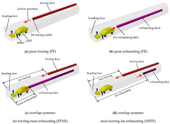 With the development of the global economy, the demands for mineral resources are persistently increased by human beings. In recent years, shallow resources have displayed a declining trend annually and the underground mining depth will become deeper and deeper in the future [1,2,3]. In addition, the higher-powered machinery that increases production levels impose an increased burden on ventilation systems to maintain an acceptable working environment [4]. As a result, the worsening thermal environments in underground mining resulted from higher virgin rock temperature and heat emitted from mechanical equipment gave rise to a lot of concerns regarding the health and safety of miners [5]. In the blind headings, the heat transferred from fragmented rock, explosives and LHDs (or roadheaders, continuous miners) with the existence of an auxiliary ventilation system could make the aerodynamic much more complex in the face area [6]. Auxiliary ventilation can be classified into three basic types, Pure Forcing (PF), Pure Exhausting (PE), and overlap systems (FFNE and NFFE) as shown in Figure 1. Therefore, to design the optimal ventilation and cooling systems, it is of great significance to carry out in-depth research on the thermal environment for high-speed ramp and tunnel developments [7].