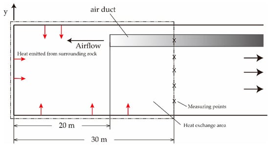As airflow in the heading face is the typical forced turbulence in the semi-closed space, the airflow velocity distribution is uneven near the mining face. The local heat transfer coefficient varies with location in a wide range. Gao et al. suggested that the dimensionless heat transfer coefficients (h/h0) of roof, side wall, floor and mining face were 9.7, 5.1, 3.5, and 6.8, respectively, with the average of 5.6 [13]. Hence, the heat transfer coefficient can be determined at 4.5 W/(m2∙K).