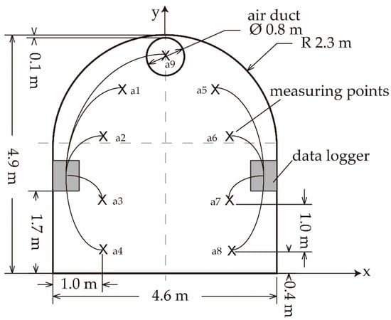 Figure 2 illustrates the location of the air duct and the measuring points near the heading from the side view. Zm was maintained about 20 m. The blind heading would advance about three meters in each blasting. Data loggers (midi LOGGER GL200, Graphtec Corporation, Yokohama City, Prefecture of Kanagawa, Japan) and thermocouples of Type K (diameter is 0.5 mm, Graphtec Corporation, Yokohama City, Prefecture of Kanagawa, Japan) were used for these measurements. The measuring interval of the data loggers was set at 30 s. The thermocouples were installed in nine locations of the cross-section (Figure 3). One of them was employed to measure the air temperature in the air duct. A blast may cause damage to the data loggers and sensors. Therefore, the sensors had to be installed about one meter from the surface of the airway and the measuring points were 30 m from the face and thus the heat exchange area was 424.6 m2.