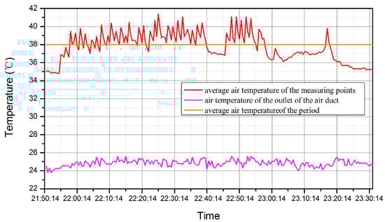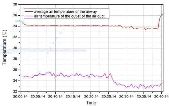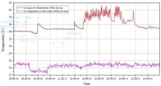 Figure 4 presents the measured results of air temperature variation with time. The average air temperature of the airway represented the average measured results of the eight thermocouples. The air temperature of the outlet of the air duct represented the measure results at the outlet of the air duct. Table 1 introduces the mining operation process. The brief discussion of the measured results is shown below: