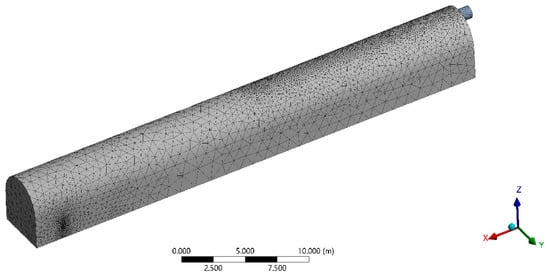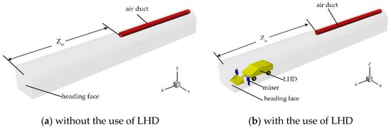 Two three-dimensional blind headings without and with the use of an LHD employing PF auxiliary ventilation system were built by Rhino 6 (Robert McNeel & Assoc, Seattle City, State of Washington, the United States) as shown in Figure 7a,b, respectively. The positive X direction points to the mining face from the entrance of the blind heading, the positive Y direction points to the left side-walls from the right side-walls and the positive Z direction points to the airway roof from the airway floor. The geometry model was an arch tunnel, 40 m long, 4.6 m wide, and 4.9 m high. A forcing duct with a diameter of 0.8 m was hung at 4 m from the floor. Its setback distance from the mining face was 20 m. An LHD was 8.0 m long, 2.5 m wide and 2 m high. The front part of the LHD was 2 m from the mining face and the miner’s height was 1.75 m, 3 m away from the mining face.