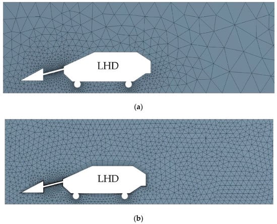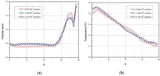 The 3D inflation capability provides high quality mesh generation close to wall boundaries to resolve changes in physical properties. In order to ensure a mesh independent solution, another two different amount of elements 1.28 × 106 and 1.75 × 106 were generated by setting different element size and local inflation mesh controls. The comparison with the element amount of 0.83 × 106 and 1.28 × 106 is shown in Figure 9. It can be observed that a finer mesh and the inflation layers were generated in the boundary layers between the airflow and LHD. Figure 10 shows the distribution curves of the airflow velocities and temperatures at the position of Y = 4.1 m, Z = 1.7 m along the airway with three different amount of elements. It can be found that the element amount of 1.28 × 106 gives about 2% deviation compared to the element size of 1.75 × 106. Whereas, the results from the mesh size of 0.83 × 106 deviate up to 15% as compared to those from the finest one. Therefore, a mesh of 1.28 × 106 elements was sufficient for the numerical simulation purposes.