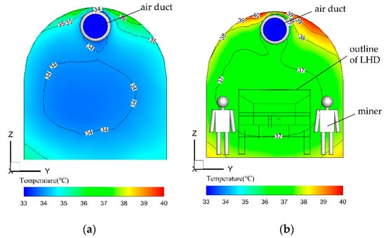 Airflow temperature distributions in the cross section of X = 14 m without and with LHD: (a) without LHD; (b) with LHD.
