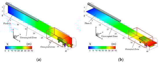 The simulation results were mainly focused on the two different planes as shown in Figure 13 including the Y = 2.3 m plane that is vertical to Y-axis (Plane A), as well as Z = 1.7 m (Plane B) which are vertical to Z-axis. The miners are typically located at the area near to the mining face. Hence, the region surrounded by X = 27 m to 37 m and Z = 0 m to 4 m was defined as the occupied zone while the remaining region was defined as the unoccupied zone in accordance with the regional distribution of miners.