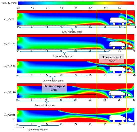 Figure 14 shows the airflow velocity distributions in Plane A, when Zm was set at five different values (specifically 5 m, 10 m, 15 m, 20 m, and 25 m). According to the International Tunnelling Association, the minimum airflow velocity should be greater than 0.3 m/s [27]. Obviously, the airflow velocity was maintained below 0.3 m/s in many regions from Figure 14 when Zm = 5 m, Zm = 10 m, and Zm = 15 m, respectively. On the contrary, when Zm = 20 m, it can be observed that the regions of low airflow velocity can achieve less coverage. With this consideration, when Zm = 5 m, Zm = 10 m and Zm = 15 m, the forcing duct outlet was too close to the mining face, and the airflow could rapidly enter the relatively closed mining region after free expansion. The LHD greatly obstructed the return airflow, resulting in low reflux velocity.