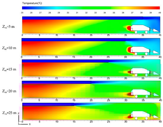 Airflow temperature distributions in plane A when Zm = 5 m, Zm = 10 m, Zm = 15 m, Zm = 20 m, and Zm = 25 m.