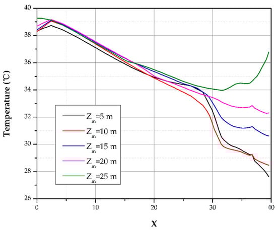 Figure 16 shows the distribution curves of the airflow temperature at the position of Y = 4.1 m, Z = 1.7 m along the airway. It can be concluded that the different positions of the forcing duct will remarkably affect the airflow temperature distributions in the blind heading, especially in the occupied zone. It can be observed that the airflow temperature fluctuated to various degrees when Zm is set at five different values at X = 30 m of the airway due to the heat emitted from the LHD. More obvious fluctuations can be seen at Zm = 5 m, Zm = 10 m, and Zm = 25 m.