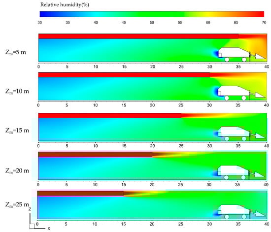 Airflow relative humidity distributions in plane A when Zm = 5 m, Zm = 10 m, Zm = 15 m, Zm = 20 m, and Zm = 25 m.