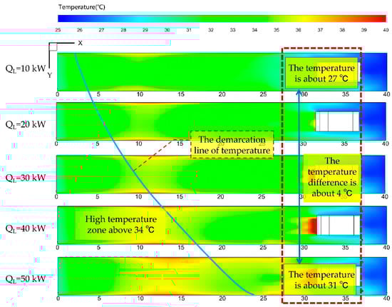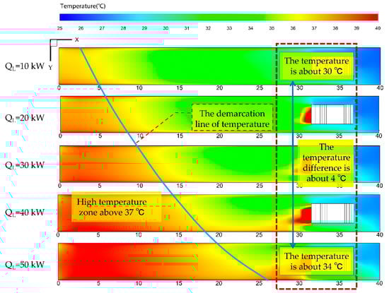 Figure 18 shows the temperature distributions in the unoccupied zone and occupied zone when QL is set at five different values (specifically, 10 kW, 20 kW, 30 kW, 40 kW, and 50 kW) which represent the heat generation from LHD under different working conditions. Obviously, when the QL increased from 10 kW to 50 kW, the average air temperature in the occupied zone increased from 30 °C to 34 °C. The airflow in the unoccupied zone is mostly constituted by the reflux. The heat transferred between the airflow and the LHD will result in the reflux temperature increasing to above 37 °C. Moreover, there is a long range and high flow velocity of the forcing system in the ventilation duct outlet that is frequently employed in the hot blind headings but it still has a limited cooling effect. Therefore, great efforts should be made to explore better ventilation and cooling schemes.