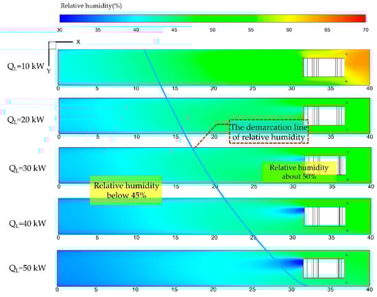 Figure 19 depicts the airflow relative humidity distributions in Plane B when QL is set at five different values. It can be observed that the raise of QL, can decrease the relative humidity in the airway. As mentioned above, the more heat generated by the LHD leads to the higher dry bulb temperature. In the case of the same moisture content of the airflow, the relative humidity decreases with the increasing dry bulb temperature.