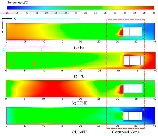Figure 21 displays the airflow temperature distributions of the four auxiliary ventilation systems at the Plane B, respectively. The simulation results show that the cooling performance in the occupied zone reaches the optimal level when applying NFFE. The airflow temperatures were reduced by about 3 °C compared with that of PF in the occupied zone when adopting the NFFE ventilation system. The temperature in the unoccupied zone would be increased but fewer miners would have to work in this region, which would enhance the energy utilization coefficient (EUC) based on EUC = (tuz − ts)/(toz − ts), where tuz was the average temperature in the unoccupied zone, ts was the supply air temperature, and toz was the average temperature in the occupied zone. Thus, it had conformed to the reasonable distribution of the cold flow [29].