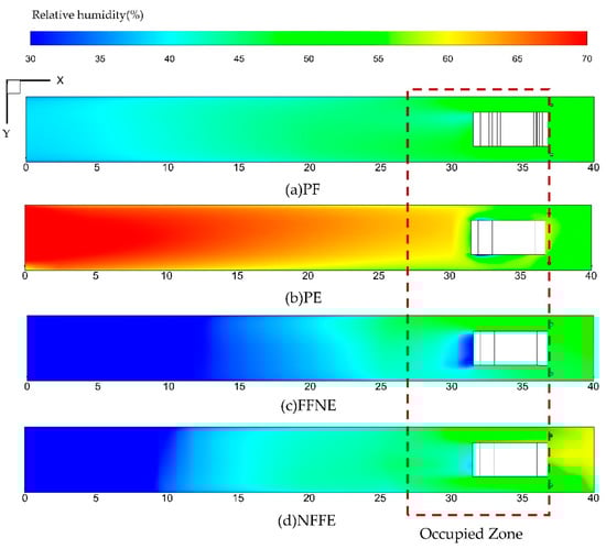 Figure 22 shows the relative humidity distributions of the four auxiliary ventilation systems at the Plane B respectively. The average relative humidity is 56.4%, 62.1%, 42.6%, and 53.5% in the occupied zone, respectively. It can be concluded that when the overlap systems (FFNE and NFFE) is applied, the relative humidity of the airflow can be controlled to an optimal level. This is mainly due to the moist air being continuously migrated by the exhaust duct.