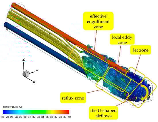 Figure 23 presents the streamlines under the NFFE ventilation system. As can be seen, within the region of X = 20~30 m, the airflow is mainly subject to the negative pressure engulfment of the exhausting fan, supplemented by the positive pressure effect of the jet flow by the blowing fan. The engulfment confluence of the exhausting fan will be enhanced under the joint action of negative and positive pressure. This region can be defined as the effective engulfment region of the exhausting duct. As the working face is far from the forcing ventilation duct, the local eddy current can be generated at the interval of X = 30~35 m. Literature [30] indicates that it is beneficial to ventilation, since the circulating airflow can absorb a large amount of moisture, thus reducing the airflow temperature and humidity in the working face.