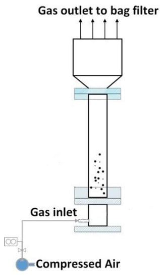 BER is a useful parameter that indicates the extent to which powders expand at a specific superficial gas velocity. It is the ratio of the bed height at operating conditions (expanded) to the fixed bed height, as defined in Equation (1). Generally, BER is used to characterize fluidization quality based on the belief that a higher BER indicates a better gas-solid contact []. A higher BER implies a large amount of gas trapped among the paint powders, which contributes to adequate gas-solid contact during the following spraying process, resulting in a smoother visual appearance. In this study, fluidization of the paint powders was conducted in a homemade fluidized bed as schematically shown in Figure 3. The fluidized bed column was made of Plexiglas that was 75 cm tall with I.D. of 5 cm. The expanded bed height was measured simultaneously when the paint powders were fluidized steadily at each set of superficial gas velocity. In this study, the BER is reported using a gas velocity ranging from 0 cm/s to near 1.0 cm/s, which is representative fluidization in a powder coating process [,].