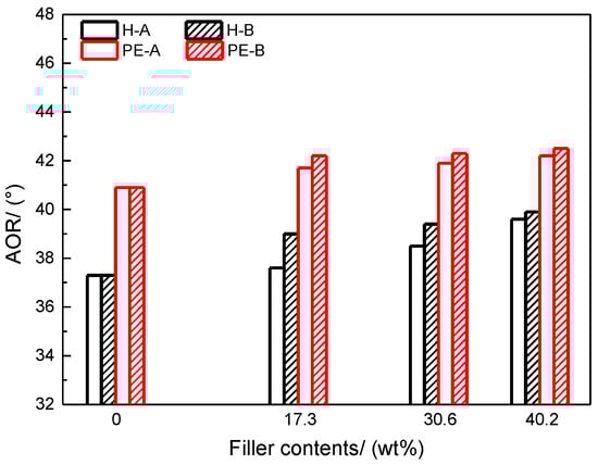 From our prior paper and industrial experience, when AORs are higher than 42°, the paint powders tend to agglomerate and thus exhibit poor flowability during the spraying process []. Accordingly, the filler contents in this study for Al(OH)3 and BaSO4 are quite acceptable for hybrid-based coatings with the addition of fluidization additives; the AORs of most of the paint samples vary below 42°, except for those based on polyester resins.