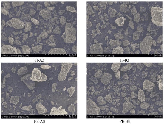 Flow behaviors of the powder paints were characterized by AOR and BER measurements. Figure 4 shows the AORs of the powder samples dry-blended with fluidization additives with respect to the fillers’ types and contents. It is clear that the type of resin system affects the AORs of the paint samples. AORs of the samples based on polyester are much higher than that of the hybrid. However, for the same resin system, the type of filler only makes a small difference in AOR, if the same amount of Al(OH)3 and BaSO4 are used. As mentioned before, the particle size distribution, shape and humidity of powder samples can be ignored because of the same manufacturing processes, operating parameters and conditions, as shown in Figure 5. The slightly higher AORs of samples with BaSO4 is partially due to its smaller D50, as shown in Table 3, which results in a larger tendency to the formation of agglomerates and poor dispersion in powder paints.