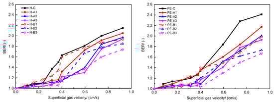 Samples incorporated with Al(OH)3 exhibit higher BERs in contrast to those containing BaSO4 at 0.93 cm/s of air velocity, as shown in Figure 7. As described earlier, BaSO4 has a much higher specific gravity than Al(OH)3. Generally, the higher the specific gravity of particles in the fluidized bed, the lower bed expansion is achieved at the same air velocity.