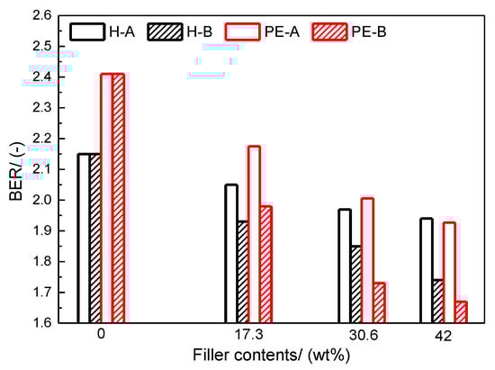 Besides, PE-powders are much sensitive to filler’s incorporation, BERs of polyester powders decrease more significantly in contrast to those of hybrid. With the increase of filler contents, the BERs of PE-B and PE-A deteriorate very fast and decrease by more than 30% and 20% in contrast to that of PE-C, while the reduction of the BERs of H-B and H-A are 19% and 10%, respectively.
