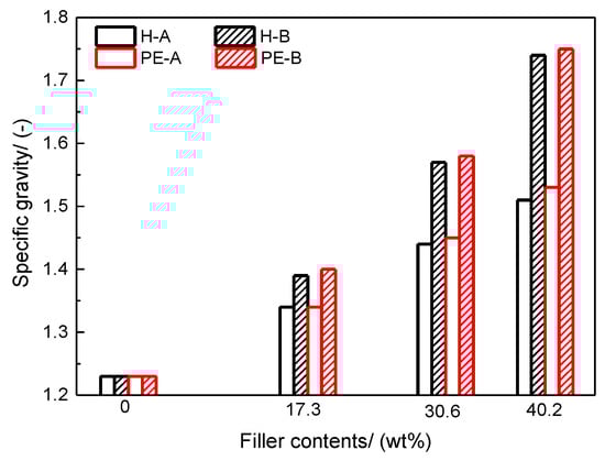 Figure 8 shows the specific gravities of paint powders respect to different contents of two fillers. It is observed that all samples possess similar specific gravities of 1.2 when no filler is incorporated. Obviously, the addition of fillers into the powder coatings directly raise its specific gravity and the samples with the same filler contents have close values. The overall density of samples incorporated with BaSO4 is much higher than that of Al(OH)3, which is due to the difference of specific densities between the two fillers.