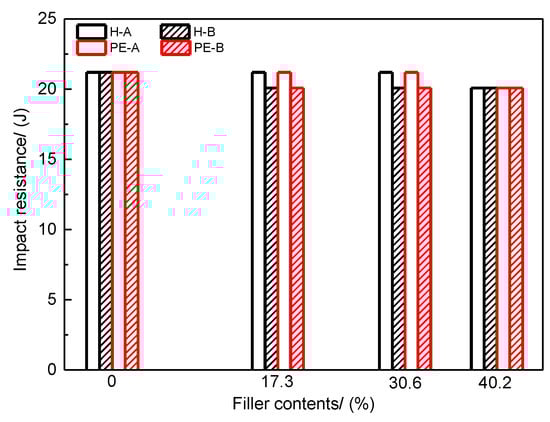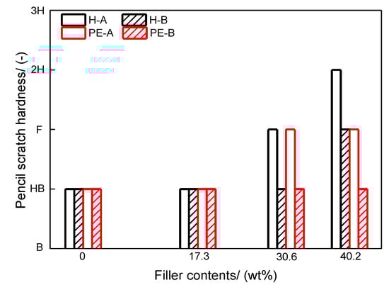 Surface hardness, impact resistance, and flexibility are all crucial properties for typical protective coating films. Figure 9 exhibits the pencil scratch hardness test comparisons of samples respect to fillers’ types and contents. As expected, owing to the similar resin and curing agent, samples exhibit similar pencil scratch hardness of HB when no filler is incorporated in. It is observed that the pencil scratch hardness of samples with Al(OH)3 increase to H when the filler content is 30.6%. While, for samples incorporated with BaSO4, the pencil scratch hardness increased to H at the maximum BaSO4 loading. Compared to BaSO4, Al(OH)3 is more efficient to increase the hardness of coating film at higher loadings. The H-A3 sample exhibited the highest hardness of 2H.