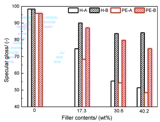 Specular gloss of samples with different fillers and filler contents at 60°.