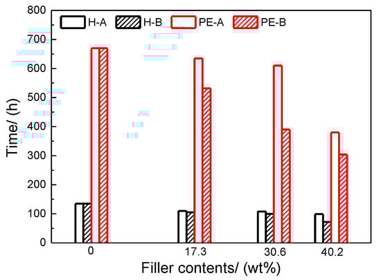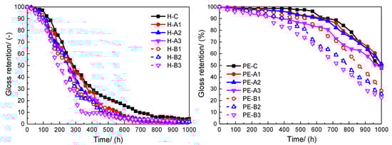 Besides, it is observed that with the use of Al(OH)3, the PE-based films exhibit much higher gloss retentions than those with BaSO4, as shown in Figure 13. Compared with Al(OH)3, the gloss retentions of most samples incorporated with BaSO4 deteriorate significantly with the increase of filler contents. Samples PE-A1 and PE-B1 keep 90% of the initial gloss for about 630 h and 530 h against UV exposure. Sample PE-A2 keeps 90% of initial gloss for more than 600 h, which is 1.5 times of that of PE-B2. When increasing the fillers’ loading to the maximum, the gloss retention of PE-A3 decreases quickly, which is partially due to the much more significant consumption of resin and curing agents in samples incorporated with Al(OH)3. A similar trend can be observed in samples based on hybrid resin systems.