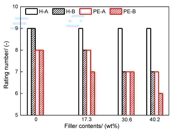 A salt spray test provides a method by which to evaluate the corrosion resistance in terms of loss of adhesion at a scribe mark. The rust creepages for scribed samples can be evaluated by rating grade between 10 and 1 (Table 6). Figure 14 presents the results of corrosion resistance of samples with different fillers and filler contents. Samples filled with Al(OH)3 exhibit better overall corrosion resistance especially for H-A samples, which keeps rating number of grade 9 throughout the whole tested filler contents, while the rating number of H-B samples decrease to grade 7 when the filler contents exceed 30.6 wt.%. The corrosion resistances of samples added with BaSO4 deteriorate significantly with the increase of fillers contents, especially at the maximum loadings, except for H-A samples.