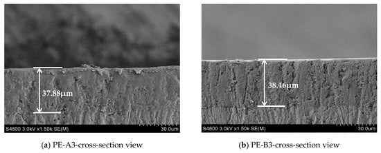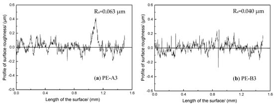 The specular glosses of finished films decreased significantly with the addition of Al(OH)3 in contrast to those of BaSO4, indicating a stronger matting effect from Al(OH)3. A matte surface can scatter the light in all directions and hence the surface appears less glossy. A micro-roughness surface is necessary for creating the diffuse light scattering responsible for the visual effects of reduced gloss. Compared with BaSO4, the better matting effect of Al(OH)3 incorporated coatings are partially due to the higher oil absorption of Al(OH)3 particles (28g oil/100 g), which is almost 3 times of that of BaSO4 (10g oil/100 g). During the curing reaction, the non-uniform shrinkage in micro scale which results from the cross-linking of binder materials, together with the presence of many filler particles occurs. In general, the higher the oil absorption value of the filler, the more binder it requires to bind it. Compared with BaSO4, the naturally higher oil absorption of Al(OH)3 particles lead to the increase of the content of Al(OH)3 particles in the top-surface of the films and thus the formation of a micro-rough surface during the curing process. The micro-roughness produced is identified by SEM images and profile of surface roughness. Figure 15 shows the cross-section view of coating films PE-A3 and PE-B3. The polymer matrix appears darker than the aluminum substrate, as indicated by the white line which marks out the interface of substrate and the coating film. The coating film adheres tightly to the substrate, without obvious defects or pores at the interface. The thickness of the coating film is approximately 38 μm. Figure 16 exhibits the surface roughness of coating films PE-A3 and PE-B3. The average roughness Ra is the arithmetic average value of the surface profile throughout the length of the testing surface. The Ra of PE-A3 is more than 1.5 times of that of PE-B3, which is due to the micro non-uniformity produced during the curing process.