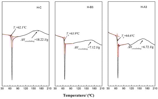 The glass transition temperature (Tg) is a useful parameter to describe curing propagation and can be linked to mechanical properties []. During the curing processes, the molecular network mobility decreases according with the increase of Tg []. This can partially explain the significantly improved pencil scratch hardness of H-A3 and H-B3.