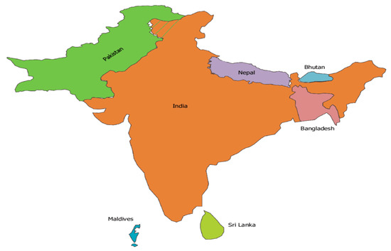 The South Asia region includes transition economies, namely Pakistan, India, Nepal, Sri Lanka, Bhutan, Bangladesh and Afghanistan (Figure 1). This region is at the center of global dramatic trends, for instance climate change, the energy crisis, resource exploitation and water security. The reasons for choosing South Asian countries in this study include their climate vulnerability and the regional energy sector’s focus on three significant issues. First, the countries of this region face enormous challenges in ensuring energy supply to sustain economic growth. Second, most of the population of this region does not have access to clean energy, especially in rural areas where people mainly rely on biomass for cooking and heating due to the lack of electricity. Third, due to the lack of limited domestic energy resources, South Asian economies are heavily dependent on the import of gas and crude oil. There are a number of studies involved with the methods employed for evaluating energy efficiency. For instance, the author examined energy efficiency from the viewpoint of accessibility, availability, acceptability, and affordability by using the DEMATEL(Decision making trial and evaluation laboratory) method [5]. Mardani et al. [6] used the data envelopment analysis (DEA) approach to study the current situation of energy efficiency and remaining energy opportunities. Kevin [7] also qualitatively investigated the reasons why the energy efficiency of China has not improved during a period of economic reform. The authors focused mainly on the relationship between energy efficiency and the energy policy of the country. Büyüközkan and Karabulut [8] assess ‘energy efficiency’ by applying an analytic hierarchy process concerning low-carbon energy. Henriques and Catarino [9] evaluate oil diversification and energy efficiency using the Herfindahl–Hirschman index (HHI). Wang et al. [10] measured the energy efficiency, trends in the oil diversification and natural gas supplies of OECD (organization for economic co-operation and development) countries by using imported oil diversification. Meanwhile, Karabulut and Büyüközkan [11] proposed a hierarchical structure for the measurement of the sustainable performance of the energy indices of developing countries.