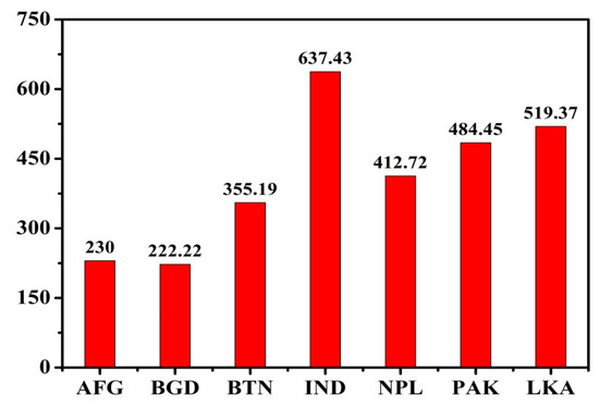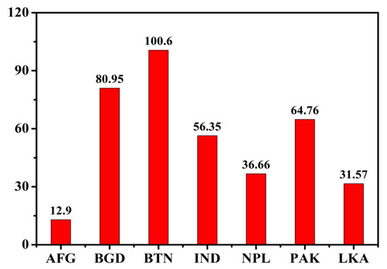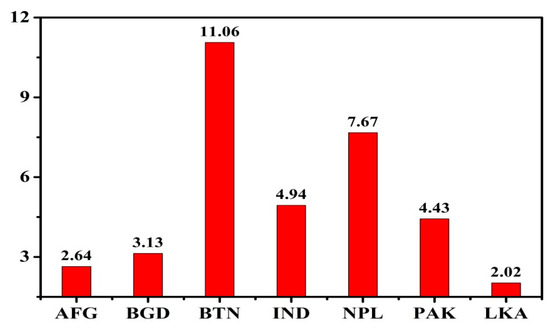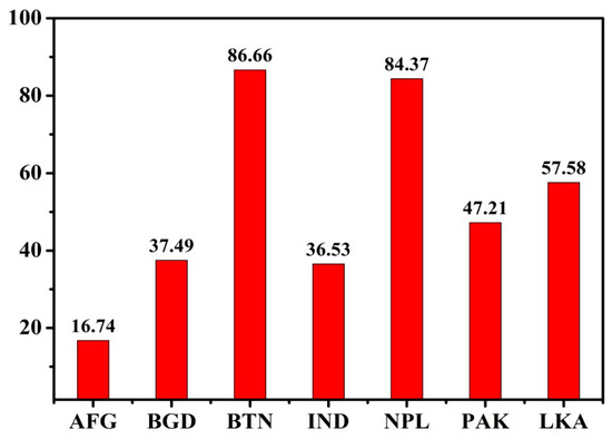 The renewable energy scores for selected countries are presented in Figure 4. It can be seen that Bhutan and Nepal have the highest score of 86.66 and 84.37 respectively, while Afghanistan has the lowest score of 16.74. Although, other countries like Sri Lanka and Pakistan also show an improved situation with respect to renewable energy with scores of 57.58 and 42.21 respectively. The above-mentioned renewable energy score includes hydropower which is also considered as a conventional power source in the region. India relies mainly on a fossil fuel economy and is facing energy efficiency pressure due to its high energy consumption rate.
